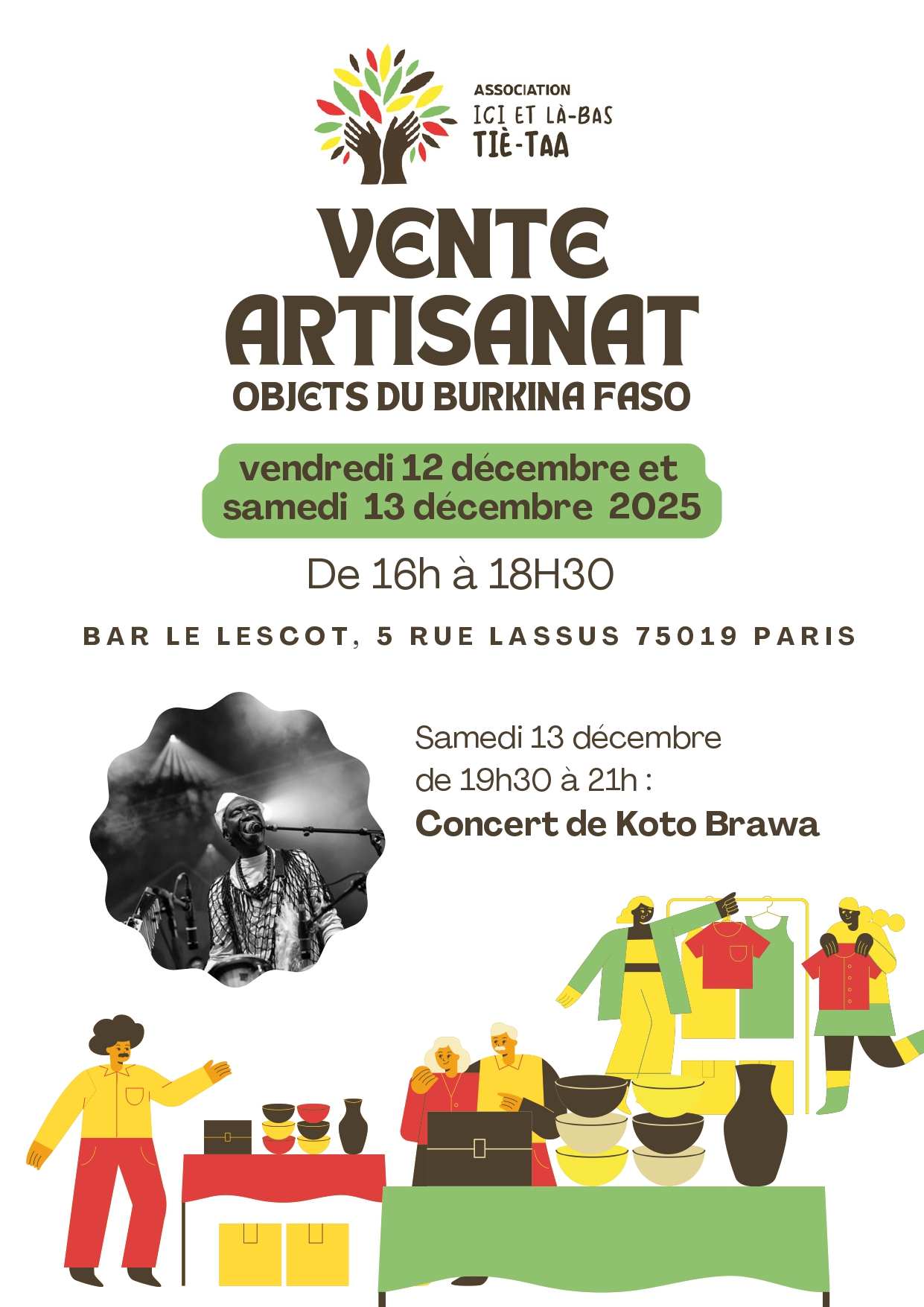Vendredi 12 et samedi 13 décembre, l’association Ici et Là-bas Tié-Taa vous propose une vente d’artisanat du Burkina Faso, accompagnée d’un concert exceptionnel de Koto Brawa.