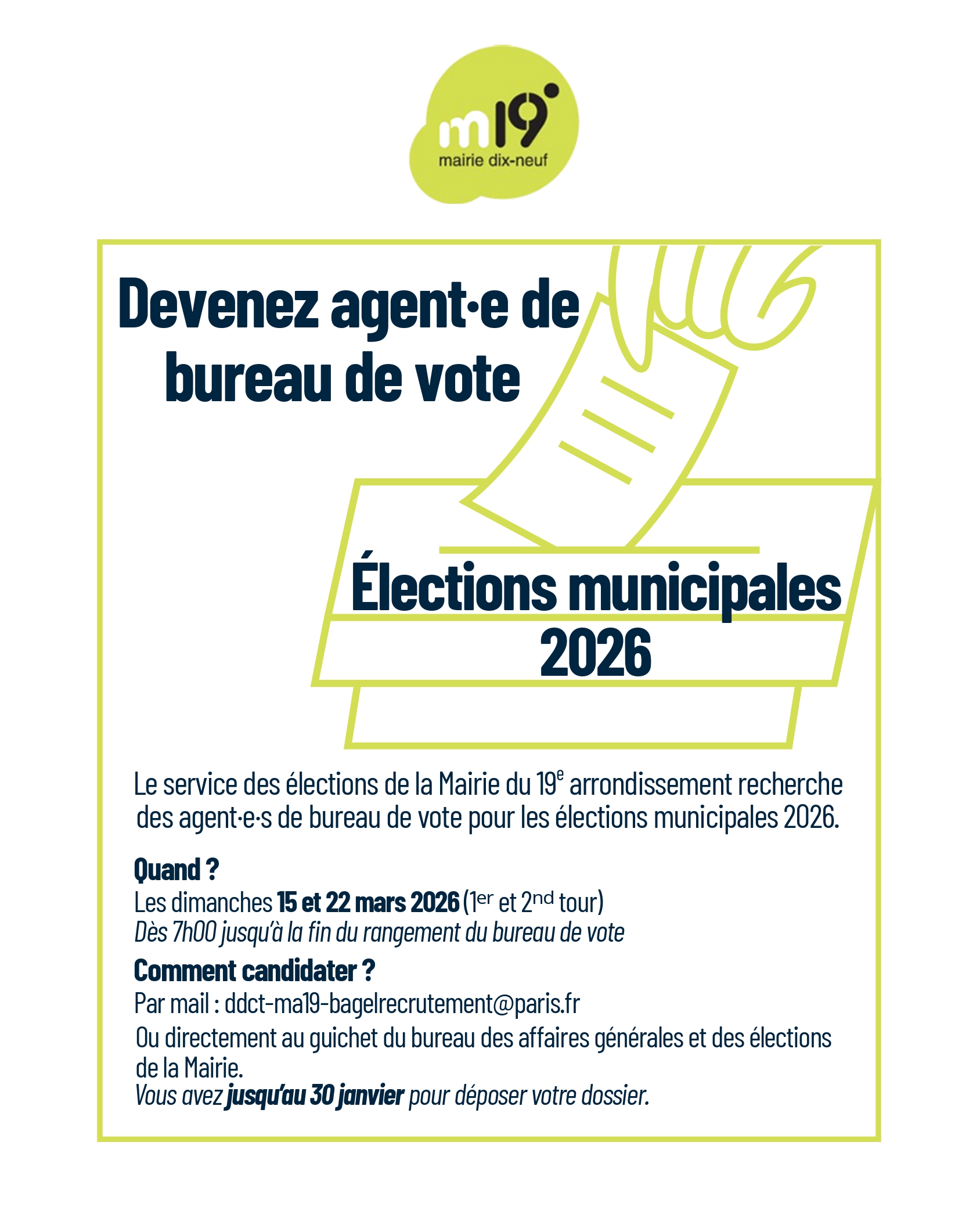 Le service des élections de la Mairie du 19 arrondissement recherche des agent·e·s de bureau de vote pour les élections municipales 2026.
