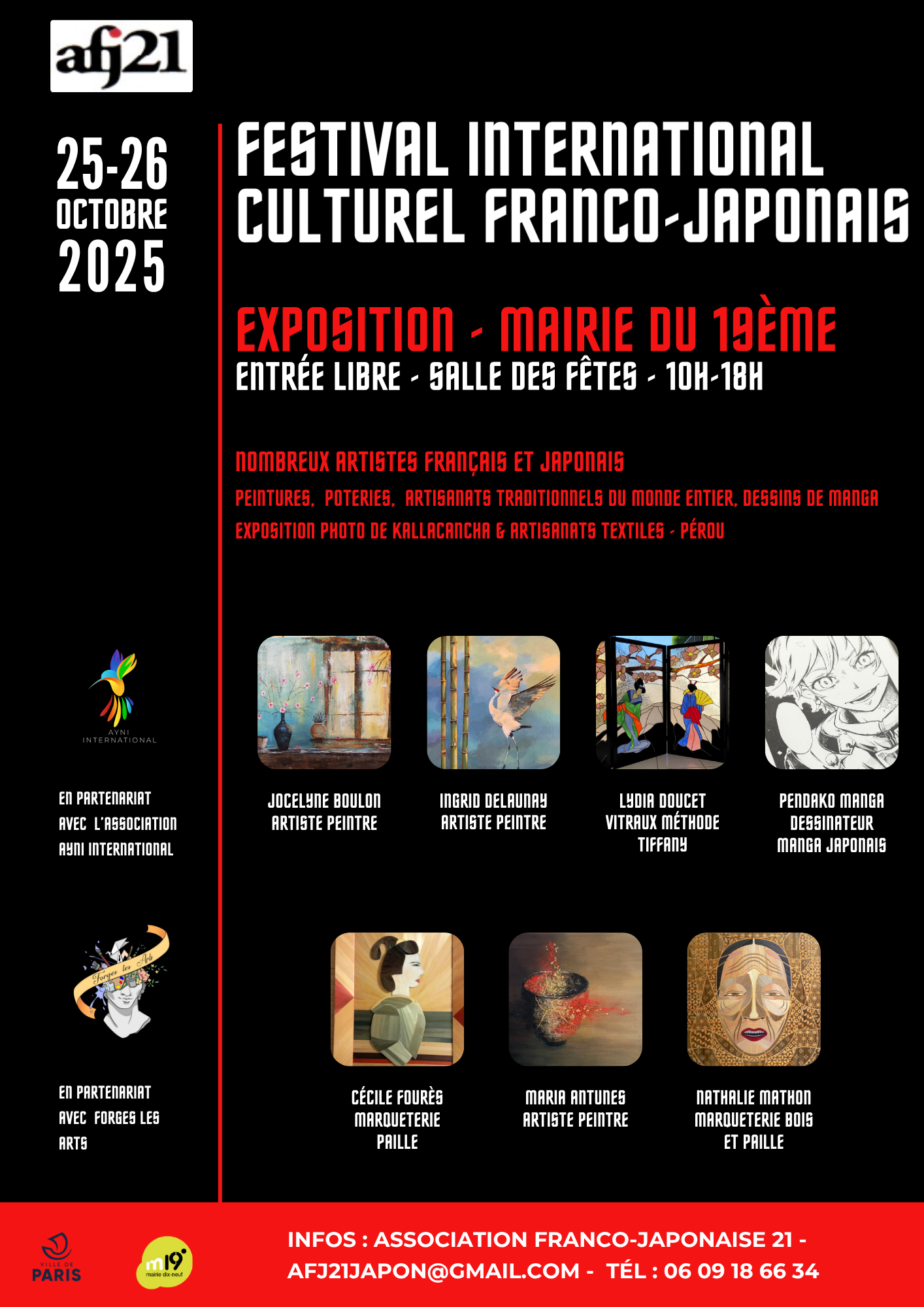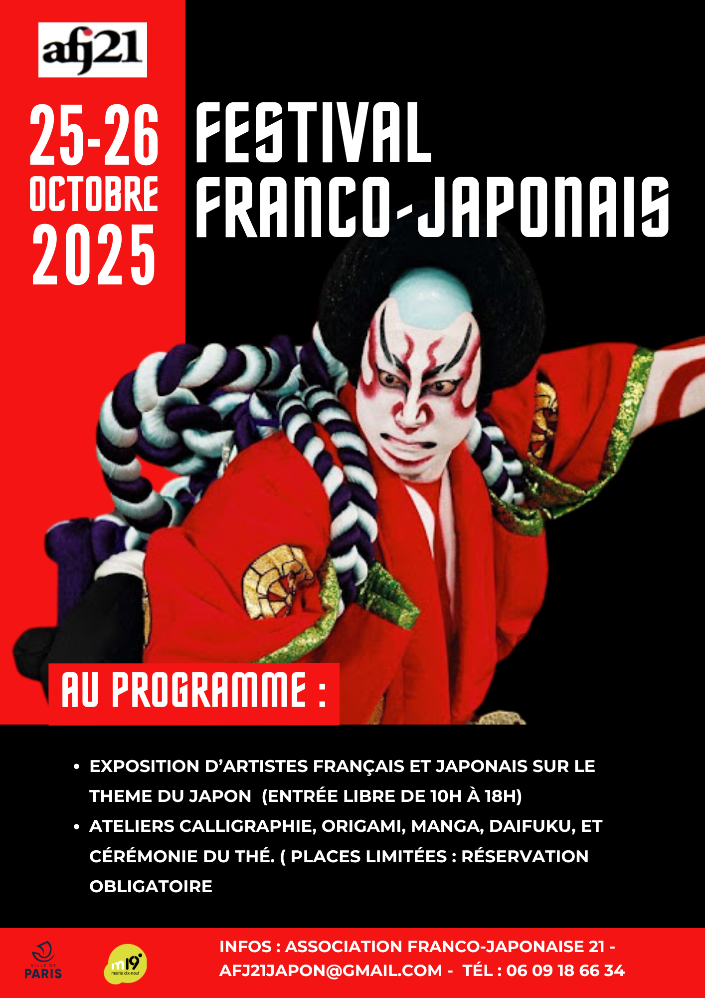 Samedi 25 et dimanche 26 octobre, de 10h à 18h, l’association franco-japonaise 21 vous invite à un festival culturel franco-japonais dans la Salle des Fêtes de la Mairie du 19e (5-7 place Armand Carrel).