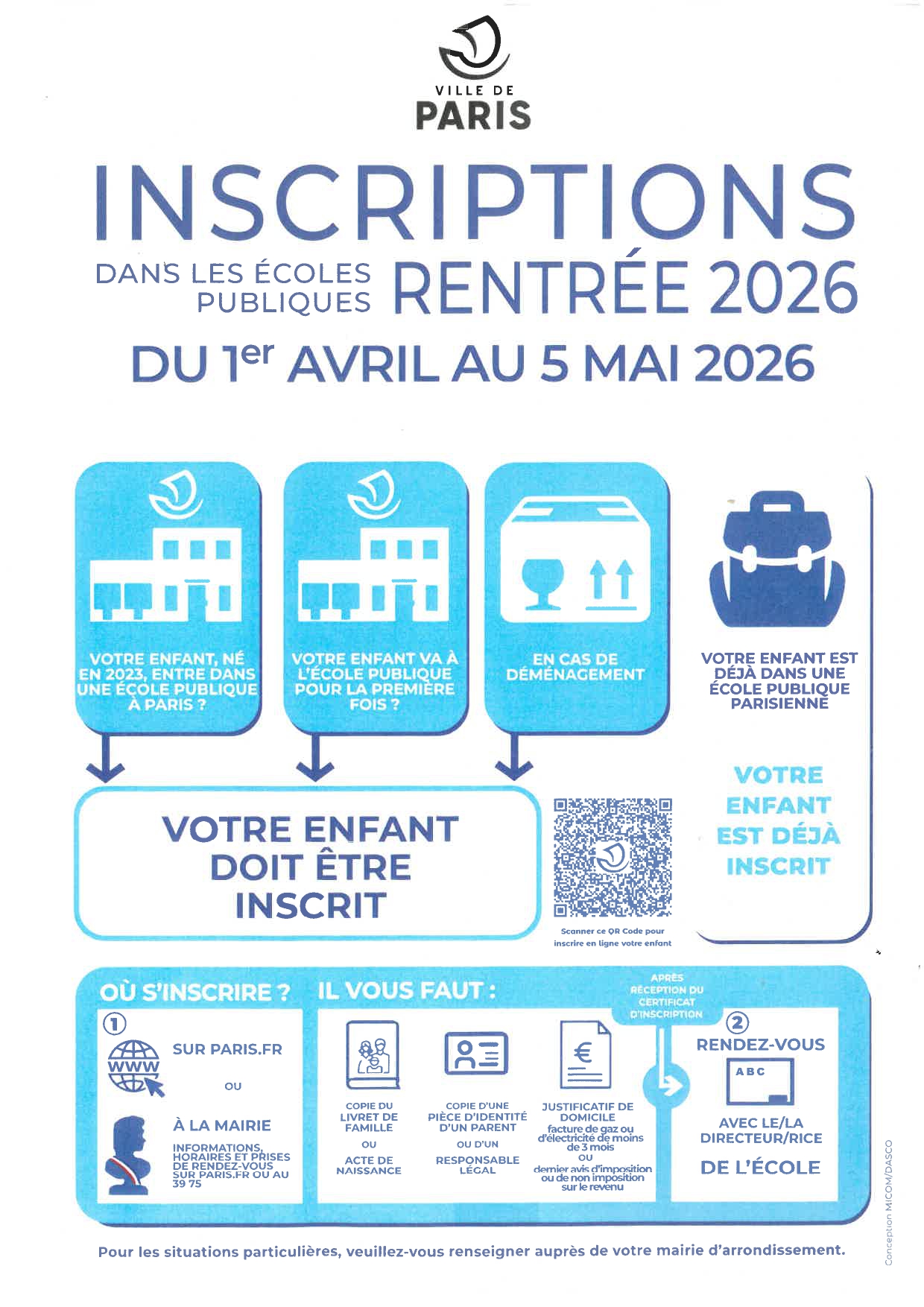 Selon le Code de l’Éducation, « la commune a la charge des écoles publiques ». C’est donc la Mairie d’arrondissement qui est seule responsable des inscriptions des enfants en âge d’être scolarisés :