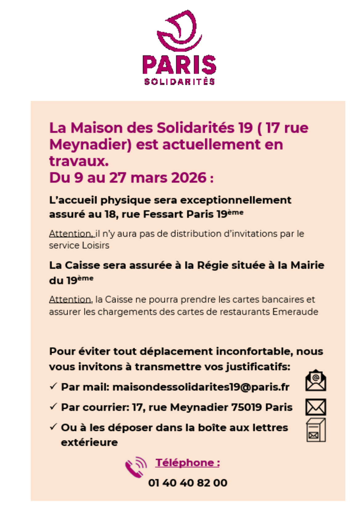 Du 9 au 27 mars 2026, l’accueil physique sera exceptionnellement assuré à l’adresse suivante : 18 rue Fessart