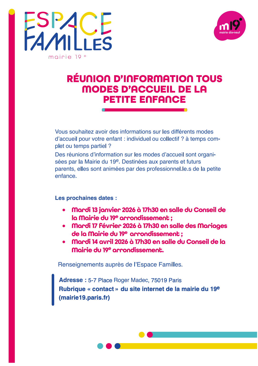 Des réunions d’information sur les modes d’accueil de la Petite enfance sont organisées à la Mairie du 19e. Destinées aux parents et futurs parents, elles sont animées par des professionnel.le.s de la petite enfance. Renseignements et inscriptions auprès de l'Espace Familles (au 01 44 52 29 19).