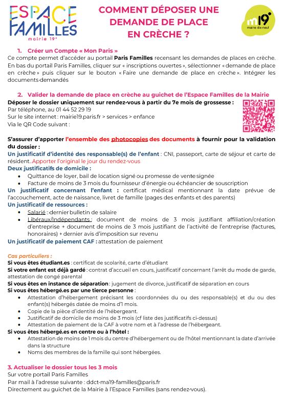 Le nombre de places disponibles ne permettant pas de satisfaire toutes les demandes, la Mairie du 19e a fait le choix de la transparence, en mettant en place une commission d'attribution des places en crèches collectives et familiales et des jardins d’enfants municipaux pédagogiques.